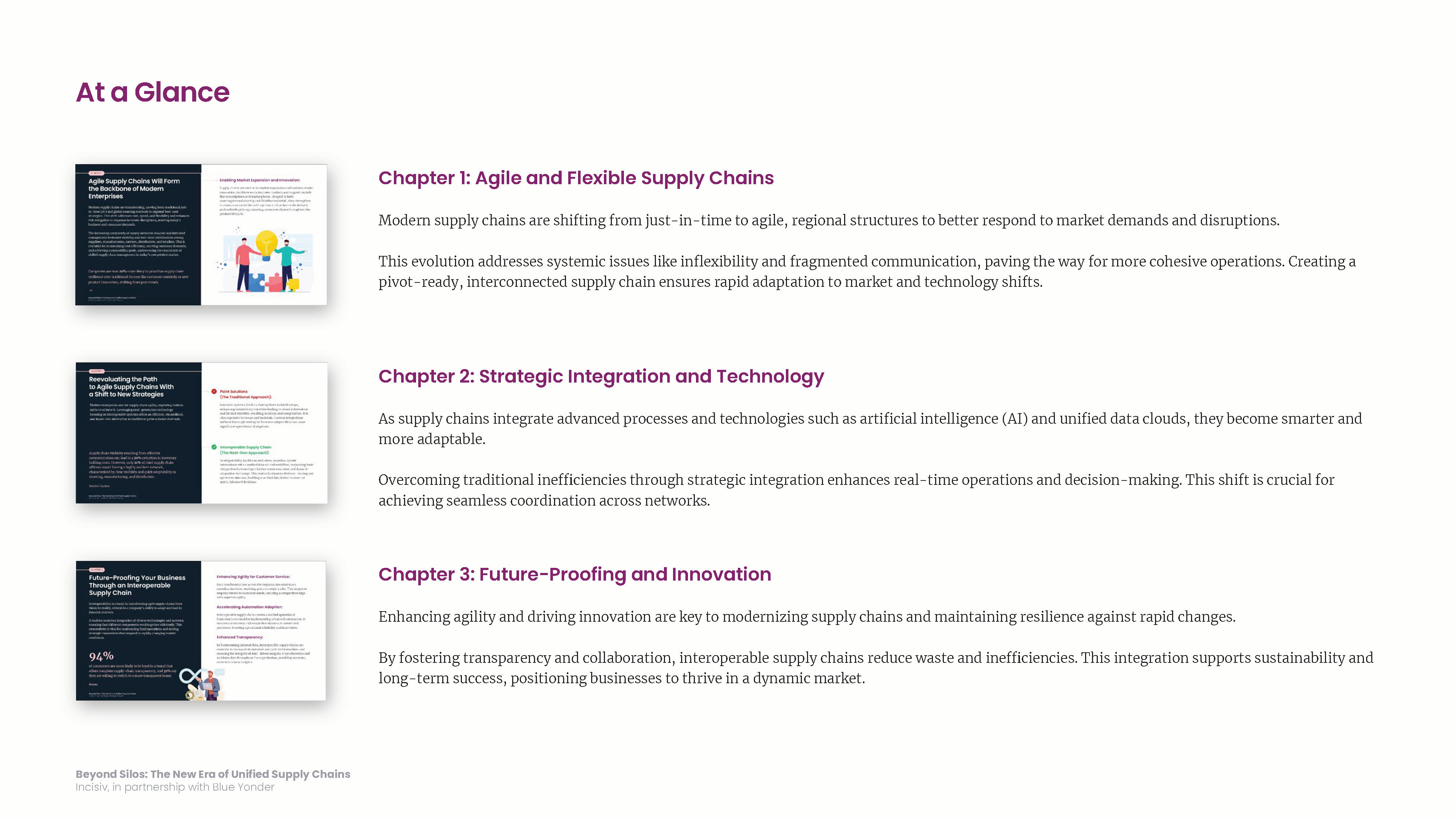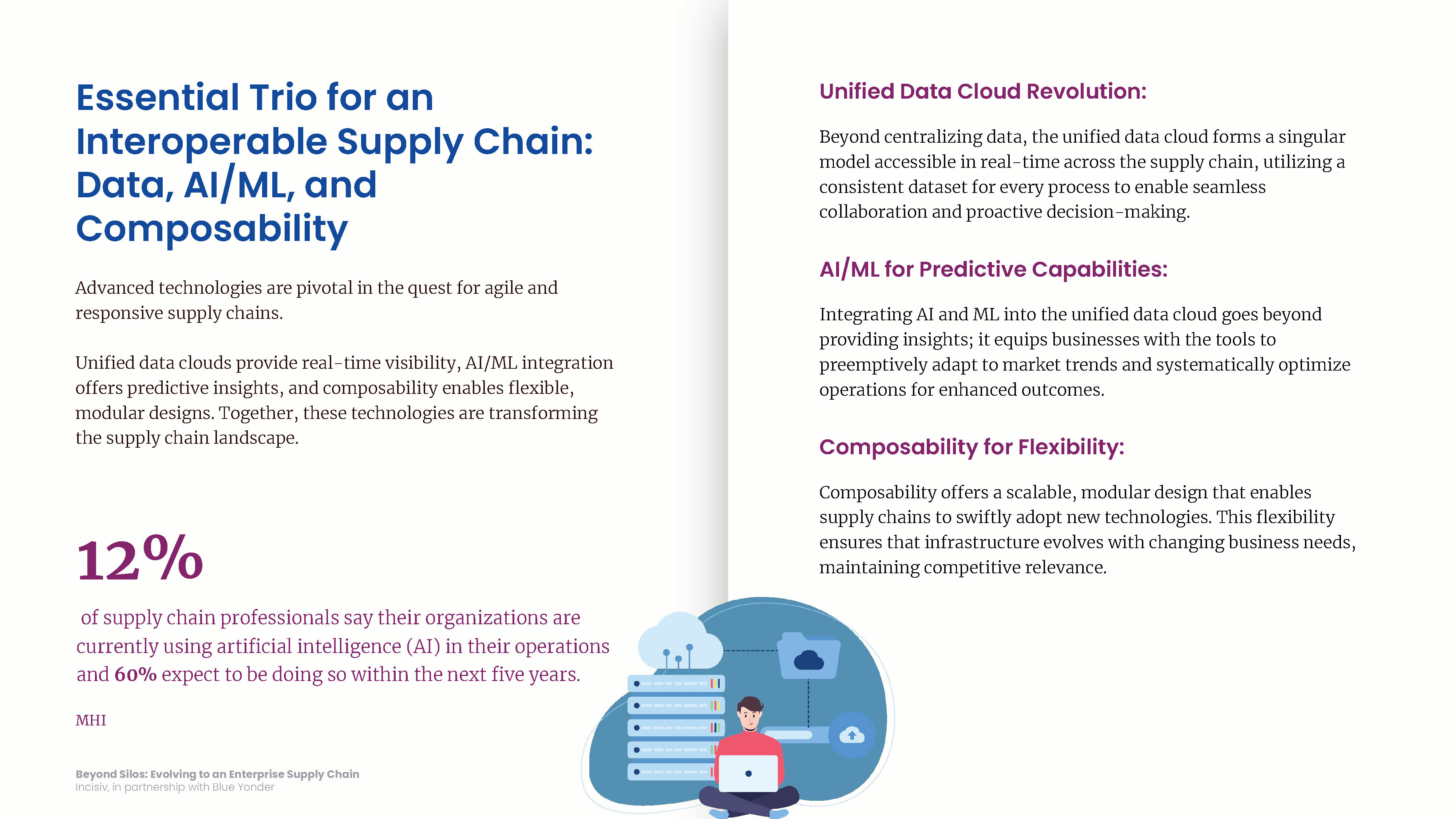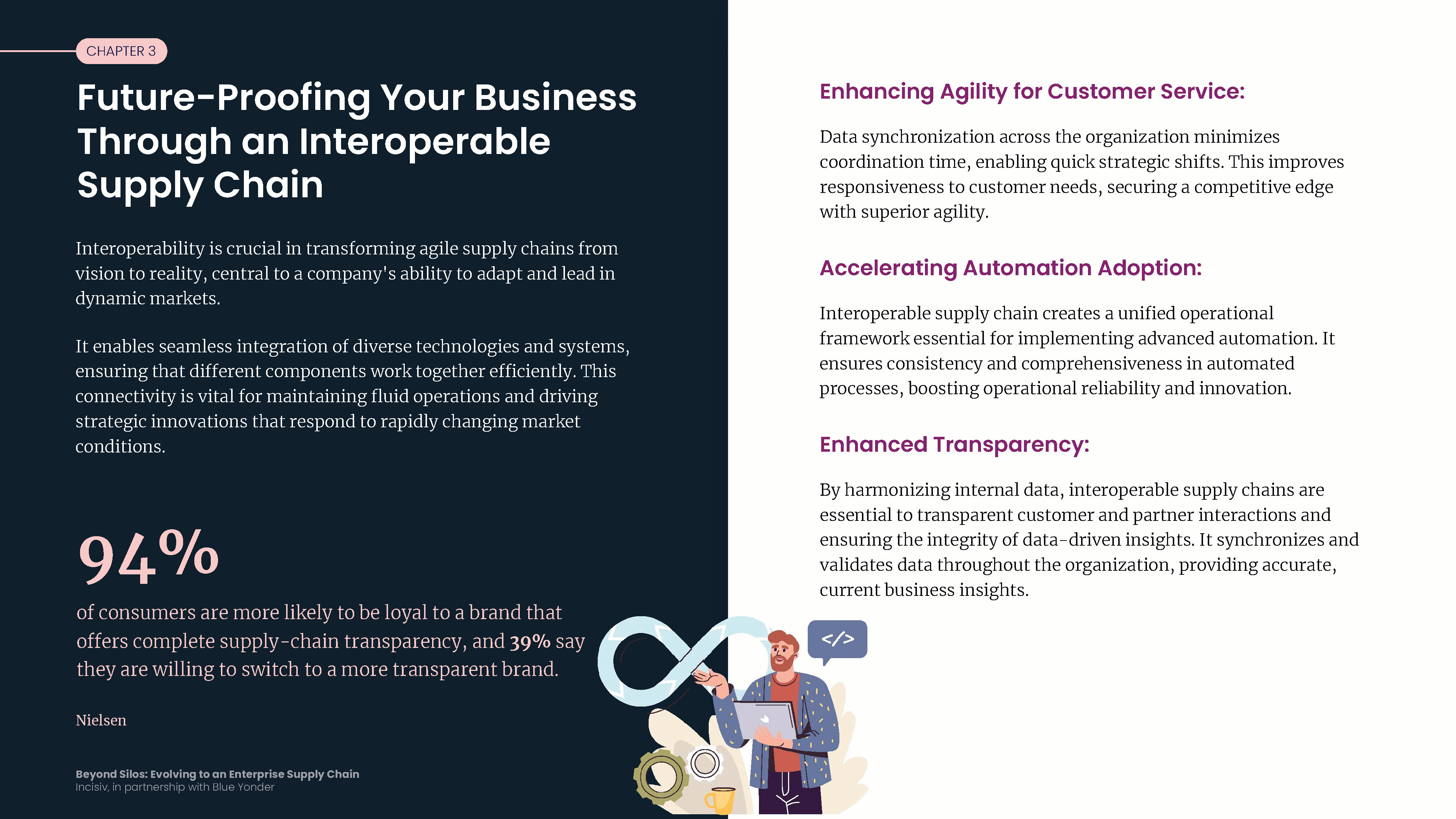 This report examines how interoperable supply chains can transform organizational agility through seamless integration, unified data models, and real-time coordination across enterprise networks. It explores the shift from traditional point solutions to next-generation approaches that enable instantaneous information flow, enhanced decision-making capabilities, and dynamic adaptability through unified data clouds, AI and machine learning integration, and composable architectures. The analysis reveals how interoperability eliminates silos, accelerates automation adoption, enhances transparency, and future-proofs businesses by creating pivot-ready supply chains capable of responding cohesively to challenges while optimizing operations across the entire organization.