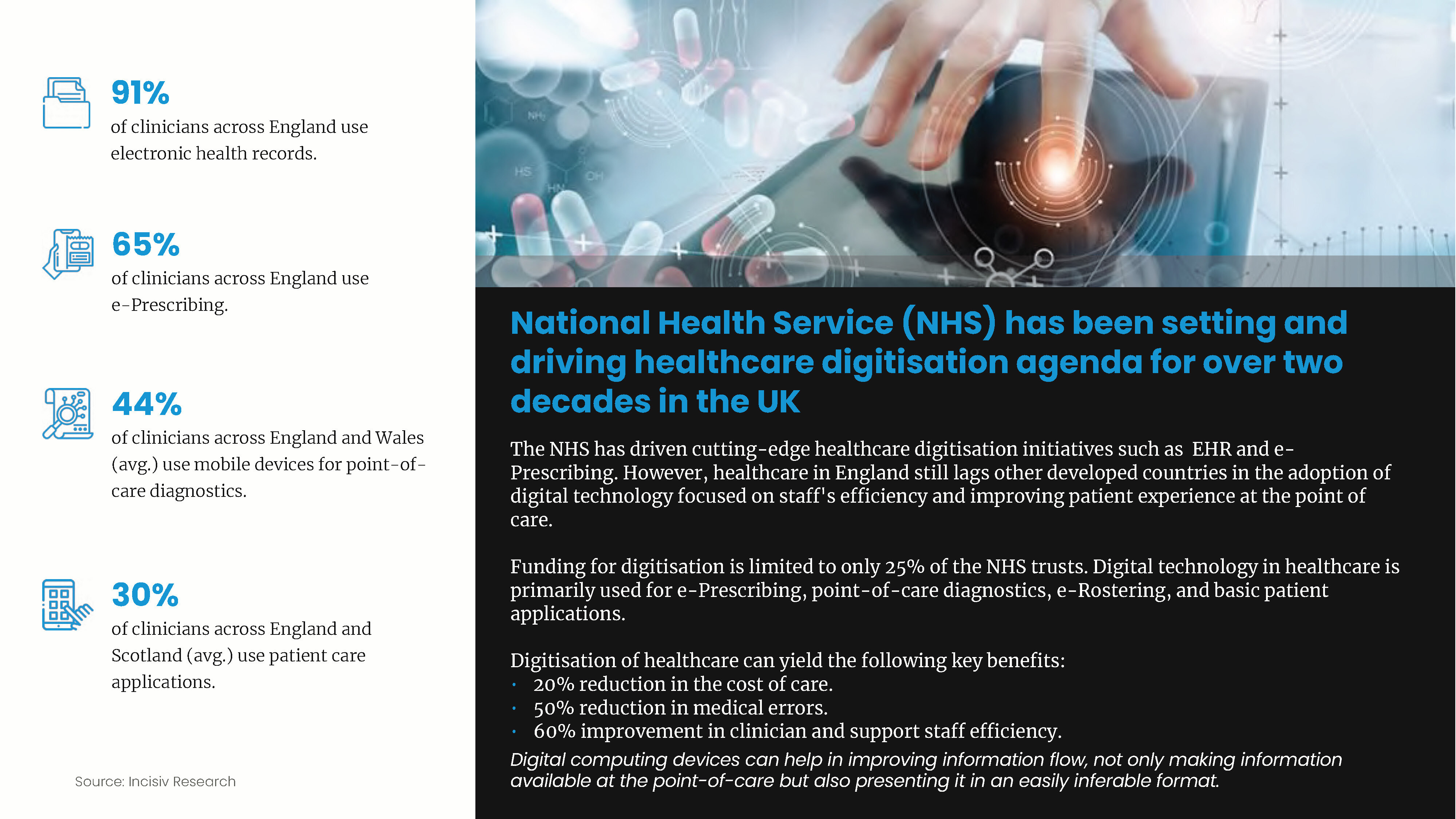 British healthcare faces a critical technology adoption gap as NHS digitization efforts struggle to meet frontline operational demands at the point of care. While high-level systems like electronic health records and e-Prescribing show strong adoption, only a fraction of clinicians utilize mobile devices for diagnostics and patient care applications. Limited funding, technology costs, and the challenge of finding appropriate solutions constrain progress, while healthcare workers cite inadequate resources as the primary barrier to digital transformation. Current mobile devices fail to meet the rigorous demands of clinical environments, lacking essential features like glove-compatible touchscreens, medical-grade durability, and compliance with electromagnetic interference standards.