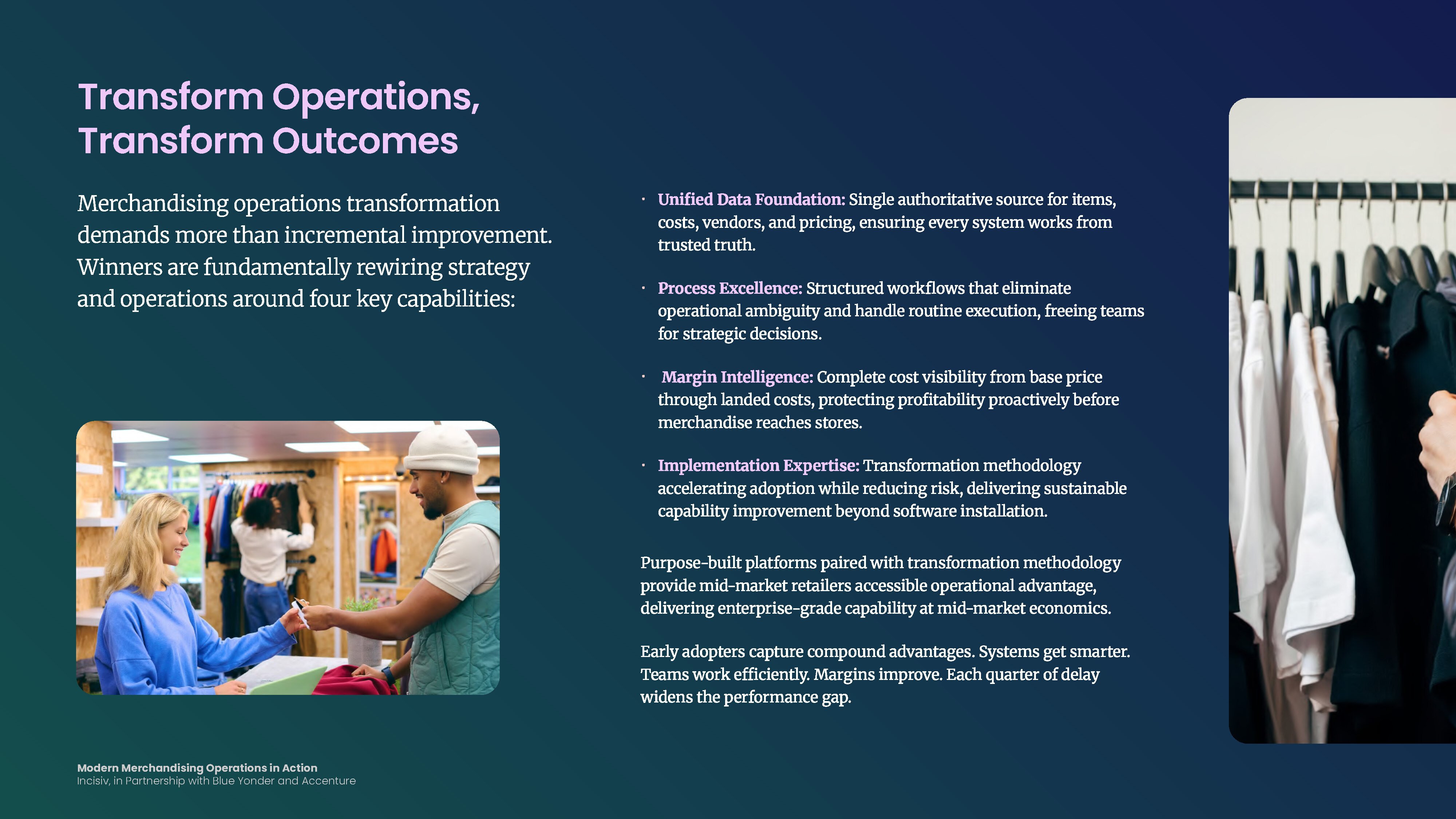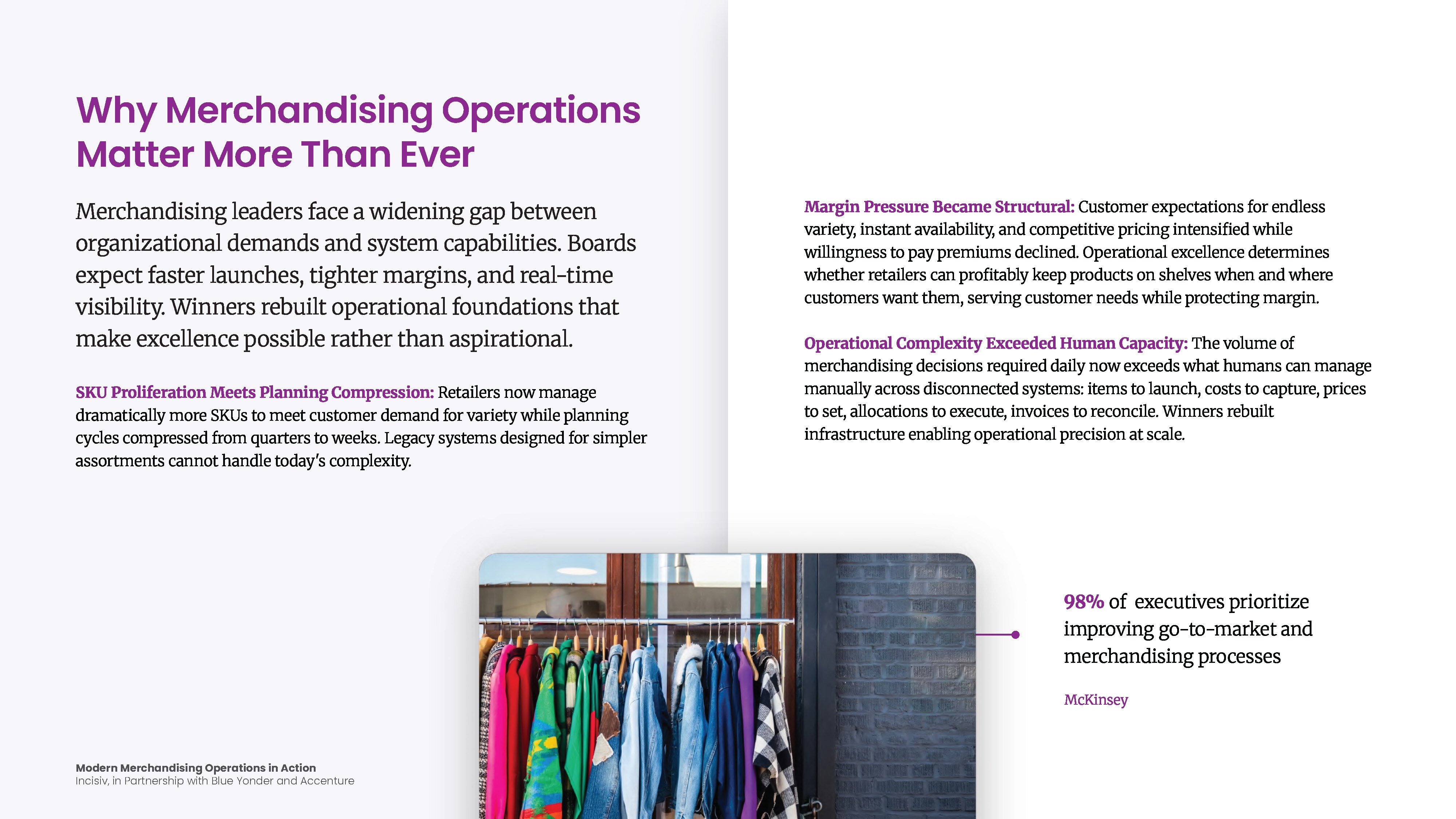 This report examines how leading retailers are closing that gap through three foundational capabilities: a unified system of record, structured process workflows, and real-time margin control. Drawing on research conducted in partnership with Blue Yonder and Accenture, it identifies the operational and organizational changes that separate retailers who react to margin problems after the fact from those who prevent them — and where mid-market retailers can capture enterprise-grade advantage without enterprise-scale investment.