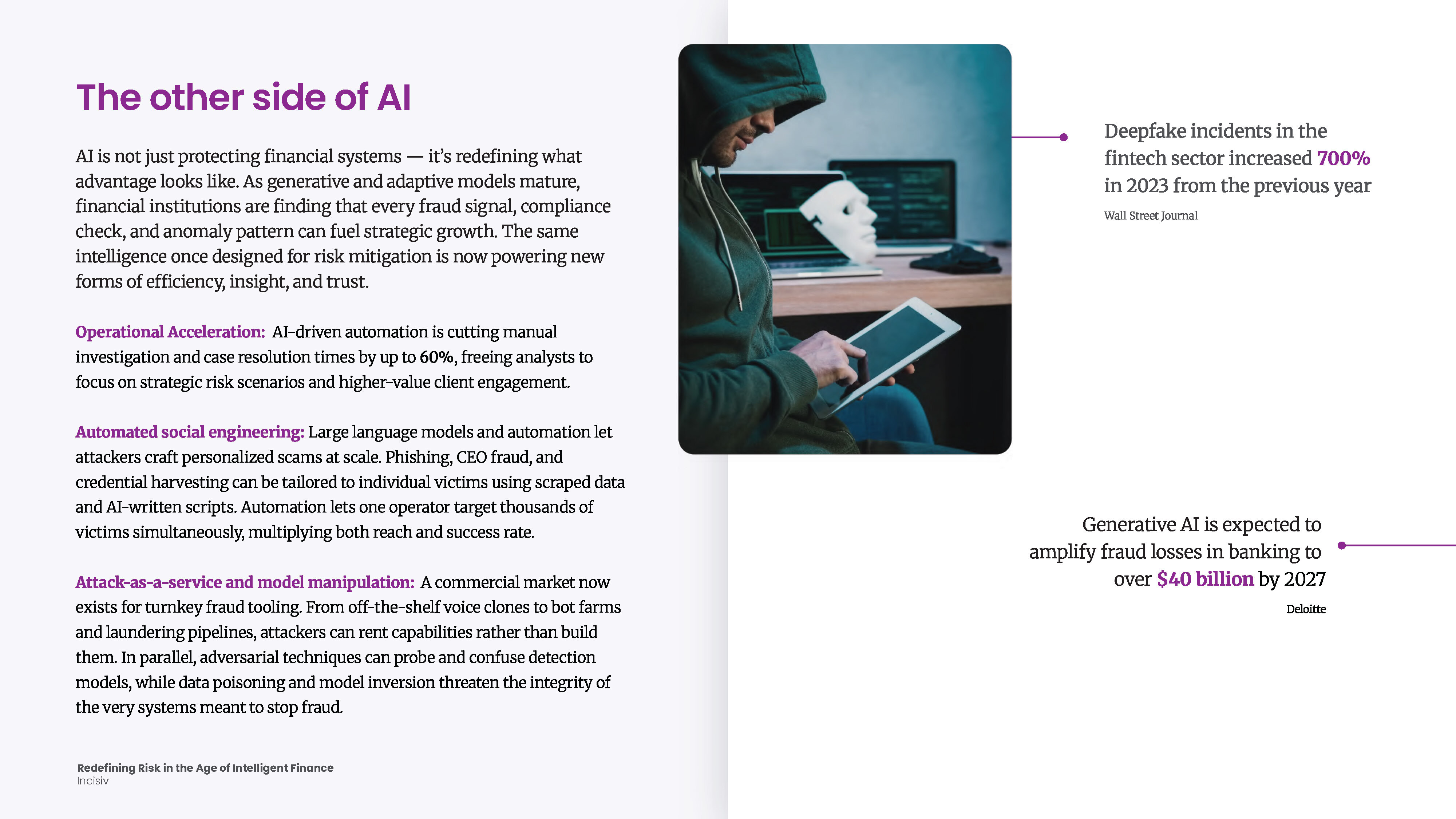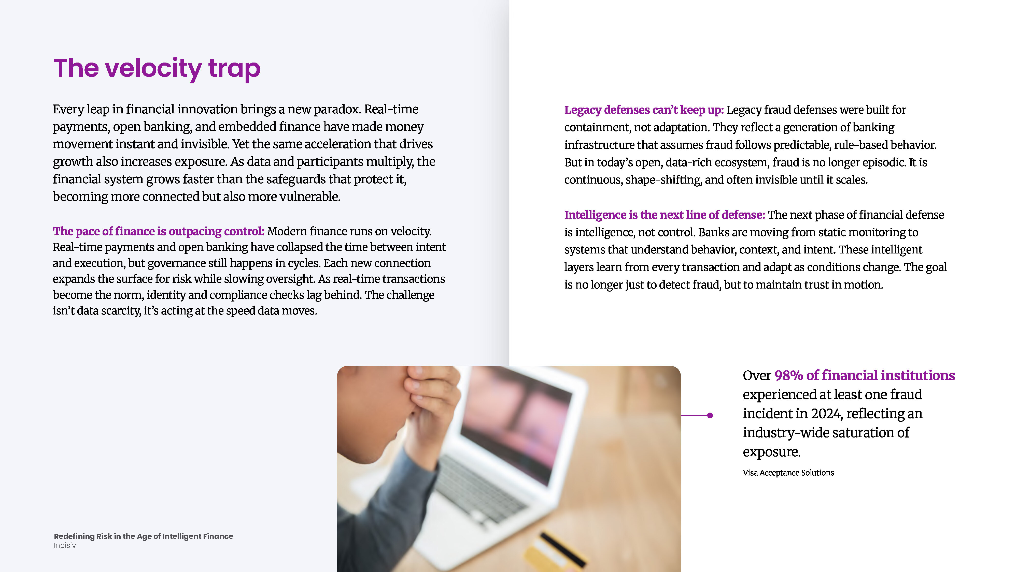 Financial institutions face an acceleration paradox as real-time payments and open banking drive growth while expanding fraud exposure at unprecedented scale. Legacy rule-based defenses prove inadequate against adaptive threats that evolve faster than traditional safeguards. Modern finance has collapsed the time between intent and execution, yet governance lags behind, creating expanding risk surfaces. Beyond direct financial losses, institutions face operational strain, customer trust erosion, and compliance pressure as generative AI enables attackers to automate fraud at scale.