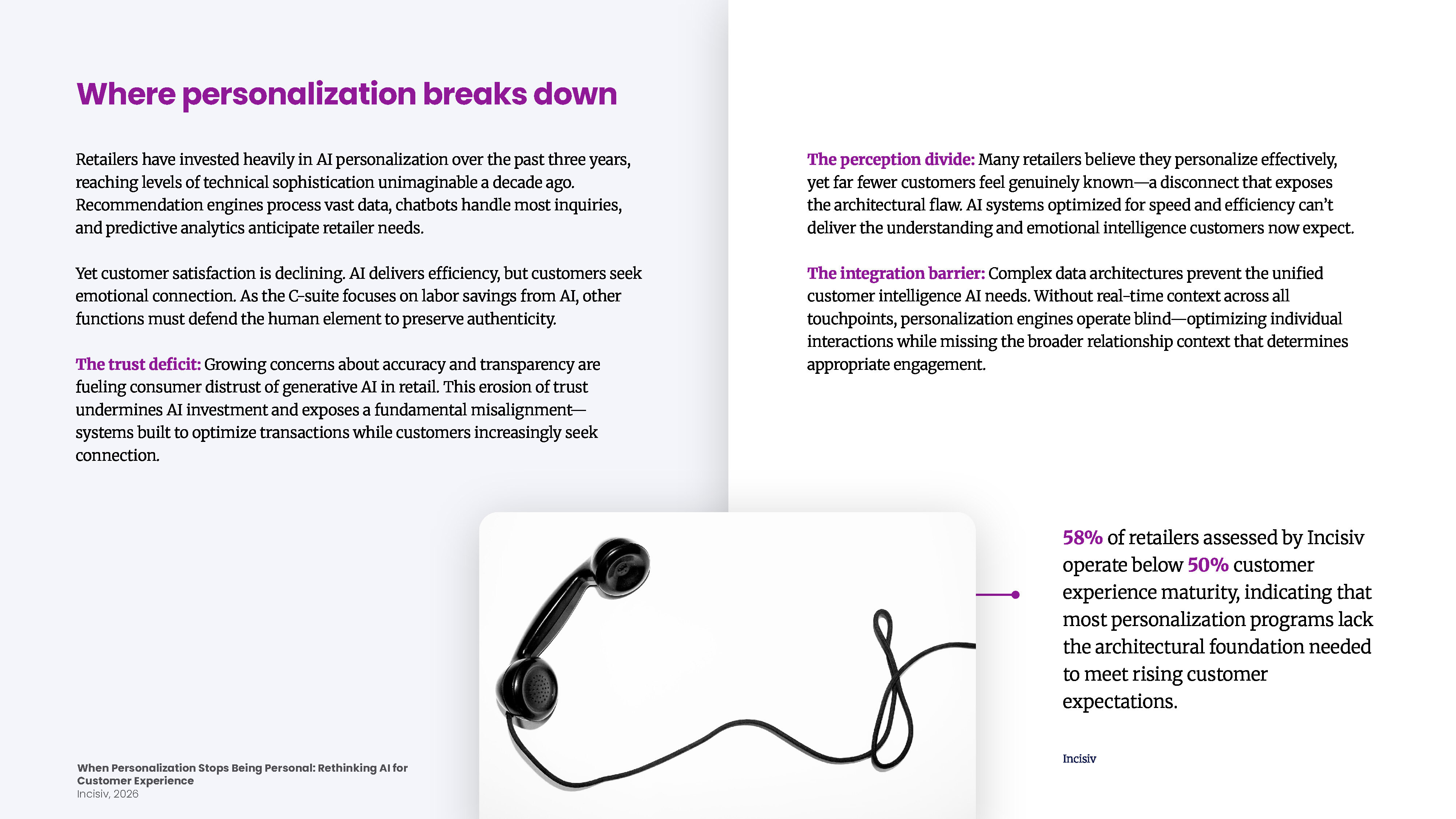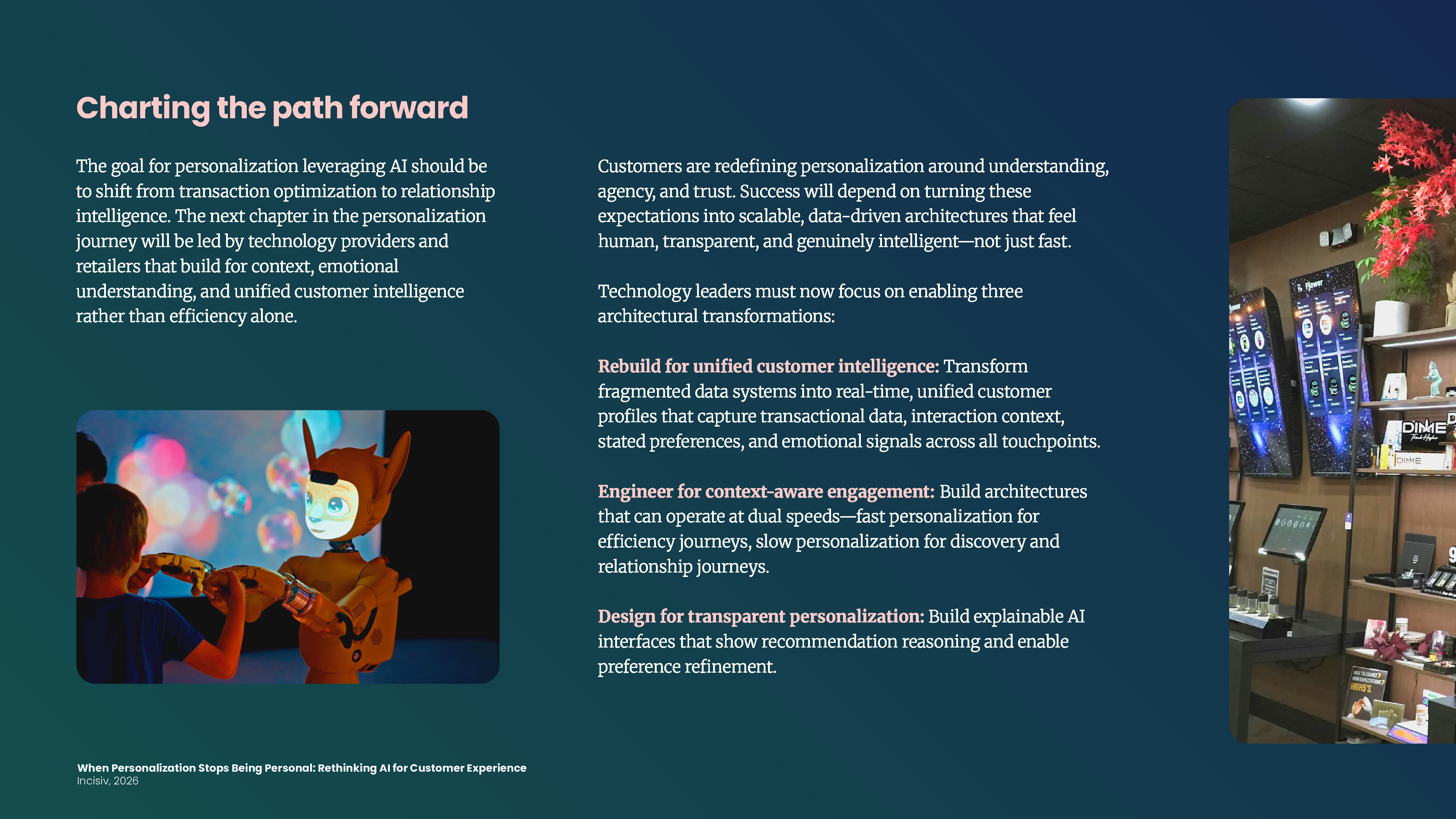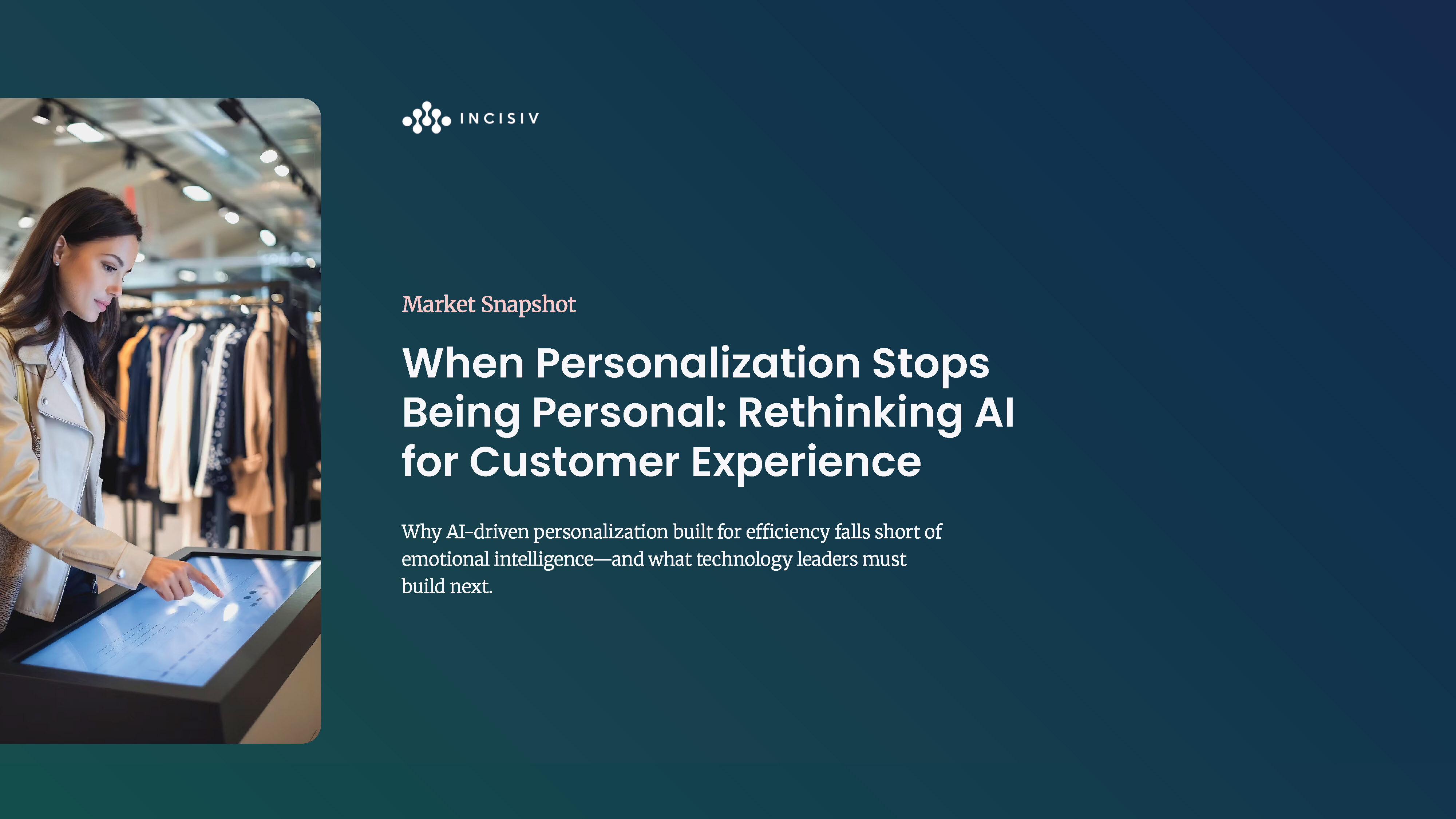 This report examines why efficiency-first personalization is eroding trust and what technology leaders must build next. The snapshot explores the shift from transaction optimization to relationship intelligence, covering the trust deficit fueled by black-box algorithms, the context collapse that flattens every interaction into the same recommendation logic, and the integration debt preventing unified customer profiles. It outlines the architectural transformations required to make AI personalization feel human again.